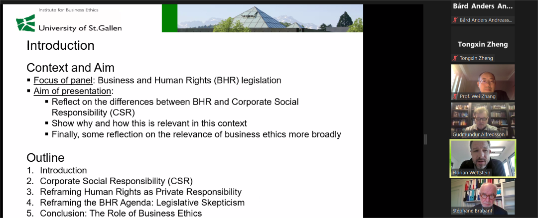 論壇第三單元由中國政法大學人權研究院特聘教授古德蒙德·阿爾弗雷德松(Gudmundur Alfredsson)主持,現(xiàn)任歐盟委員會法律事務委員,曾任比利時副總理兼外交部長迪迪埃·雷恩戴爾(Didier Reynder)先生、巴黎三一國際(Trinity LLP)高級合伙人史蒂芬·布拉班特(Stéphane Brabant)先生、瑞士圣加侖大學商業(yè)倫理研究院佛洛里安·維特斯坦(Florian Wettstein)教授、挪威人權中心的巴德·安德斯·安德烈亞森(Bard Anders Andreassen)教授、丹麥人權研究院高級顧問凱瑟琳·布洛赫·韋貝格(Cathrine Bloch Veiberg)、轉變公司標準部門副主任魯本·贊德弗利特(Ruben Zandvliet)先生等來自國外的工商業(yè)與人權領域的專家,圍繞“企業(yè)人權和環(huán)境責任:區(qū)域與國家立法”的主題展開討論,會上特別就歐盟對企業(yè)責任的區(qū)域立法與國家立法進行了詳細的介紹和說明,還從理論與實踐的層面說明了通過國內立法,使UNGP由國際軟法轉向國內硬法,使工商企業(yè)承擔保護人權責任和義務的必要性與重要性。同時,專家們還有與會嘉賓對“挪威透明法案”“企業(yè)人權盡責立法的國家實踐”和“企業(yè)責任與商業(yè)倫理”“企業(yè)人權責任如何(重塑)法律的?”等話題展開熱烈討論。