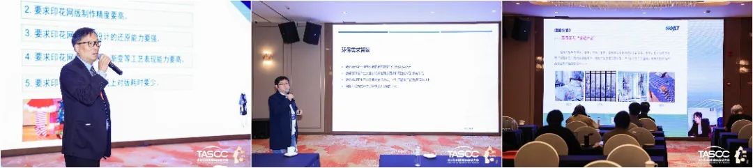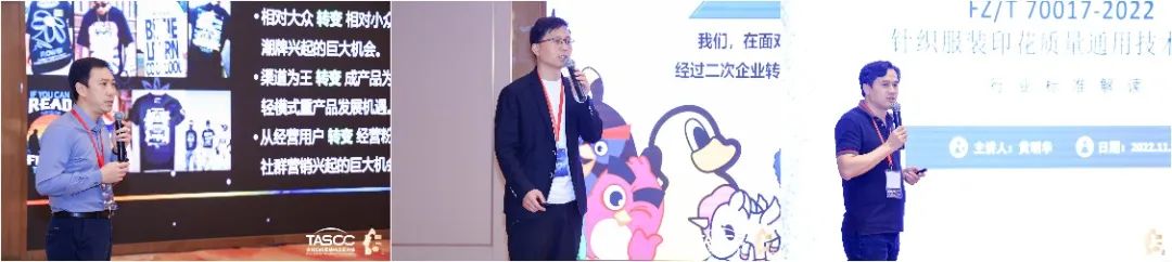 在紡織服裝印花科技發展會議上,與會企業代表紛紛獻計獻策。田菱精密網版科技(昆山)有限公司精密制版事業部部長秦頎新分享了激光快速制作高精細印花網版的要求和性能優勢;杭州景華紡織科技有限公司總經理梁樹奇闡述了滌綸面料免洗數碼直噴工藝以及在服裝及運動面料上的應用前景;沈陽飛行船數碼噴印設備有限公司紡織事業部總經理陳艷艷就精準高效的雙面同步數碼噴墨印花技術及市場進行了分析;廣州三義文訊科技有限公司總經理李巖就企業如何應對T恤印花“一件起訂”柔性生產新趨勢提出了新解決方案;紅紡文化有限公司IP授權中心創新事業部總經理王海濱就IP服裝印花的潮流趨勢進行了展望;中山市紡織工程學會會長黃明華詳細解讀了行業標準《針織服裝印花質量通用技術要求(FZ/T 70017-2022)》。