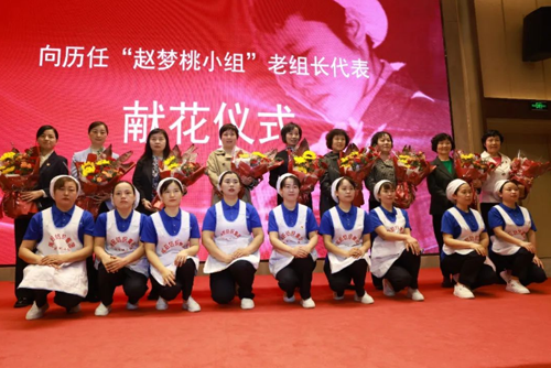 “趙夢桃小組”歷任組長也來到大會現(xiàn)場。為表達對老組長們的敬意與愛戴之情,“趙夢桃小組”現(xiàn)任組長王丹帶領(lǐng)她的姐妹們,精心準(zhǔn)備了鮮花獻給趙夢桃小組第3任組長王西京、第5任組長王廣玲、第7任組長韓玉梅、第8任組長劉育玲、第9任組長徐保鳳、第10任組長周惠芝、第11任組長劉小萍、第12任組長王曉榮、第13任組長何菲。