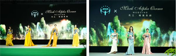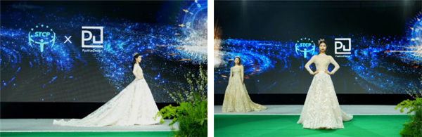 隨著現場的燈光漸暗,一場以“綠色纖維”為原料的成衣走秀拉開帷幕。本次大秀主要呈現了禮服、運動裝、婚紗三大品類的服裝,參與的高定和品牌有:VIVIANNEJIALIU、PJ、芮邦、馬克華菲、馬克•蝶麗奧娜。模特身著華美絢爛的色彩禮服、時尚輕便的運動裝以及飄逸靈動的紗裙游走在T臺上,演繹著“綠色纖維”的時尚魅力,直觀生動的展示了“綠色纖維”多場景應用的適配性。