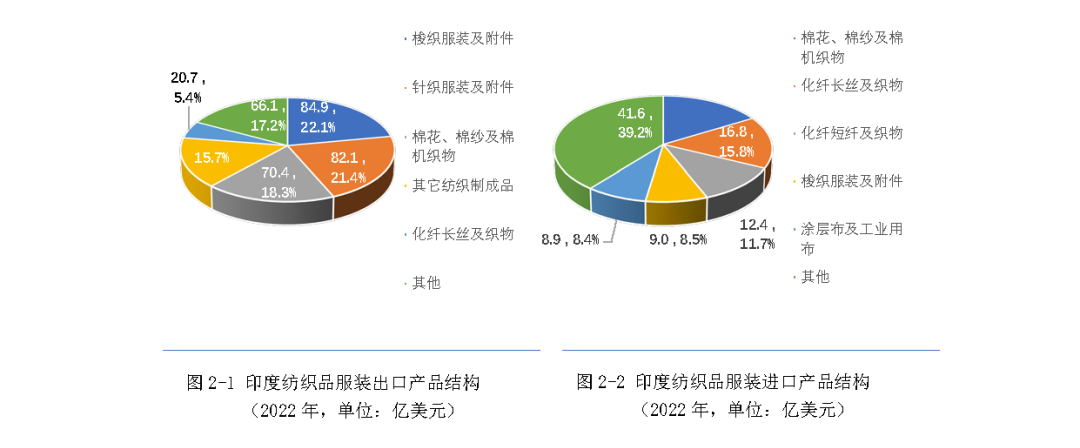 目前,印度是僅次于中國的世界第二大紡織品出口國和排位第七的服裝出口國。根據印度工貿部數據,2022年印度紡織品服裝出口額為384.4億美元,出口市場較為分散,主要包括美國(占比28%)、孟加拉國(占比9%)、阿聯酋(占比6%)及英國、德國等歐洲國家。從出口品類看,服裝是主要出口產品,占紡織品服裝出口總額的43.5%,針織服裝和梭織服裝出口比重相當,其次是棉花、棉紗及棉機織物(占比18.3%)。同期,紡織品服裝進口額為106.1億美元,中國是印度第一大進口來源地,占進口總額的38%,其次是孟加拉國(占比11%)、美國(占比7%)。主要進口產品為棉花、棉紗及棉機織物(占比16.3%),化纖長絲及織物(占比15.8%),化纖短纖及織物(占比11.7%),梭織服裝(占比8.5%)。