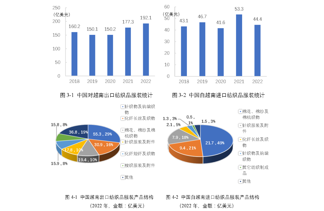 中越兩國(guó)紡織產(chǎn)業(yè)鏈融合發(fā)展持續(xù)走向深化,越南服裝加工業(yè)的成本優(yōu)勢(shì)及在發(fā)達(dá)國(guó)家市場(chǎng)的關(guān)稅優(yōu)勢(shì)明顯,我國(guó)紡織行業(yè)則在完整產(chǎn)業(yè)體系方面表現(xiàn)出顯著競(jìng)爭(zhēng)力,為越南出口加工業(yè)提供了優(yōu)質(zhì)紗線、面料及高品質(zhì)、高性價(jià)比的紡機(jī)設(shè)備支持,越南超過(guò)半數(shù)的進(jìn)口面料來(lái)自中國(guó)。根據(jù)中國(guó)海關(guān)統(tǒng)計(jì),2022年,中國(guó)與越南紡織品服裝進(jìn)出口總額達(dá)236.5億美元,其中中國(guó)對(duì)越南出口額為192.1億美元,自越南進(jìn)口額為44.4億美元。中國(guó)對(duì)越南主要出口產(chǎn)品為針織物及鉤編織物(占比29%),化纖長(zhǎng)絲及織物(占比16%),棉花、棉紗及棉機(jī)織物(占比10%),針織服裝(占比10%)等。中國(guó)自越南主要進(jìn)口產(chǎn)品為棉花、棉紗及棉機(jī)織物(占比49%,主要是進(jìn)口我國(guó)紡織企業(yè)在越南投資生產(chǎn)的棉紗及織物),針織服裝(占比21%),化纖長(zhǎng)絲及織物(占比18%)等。