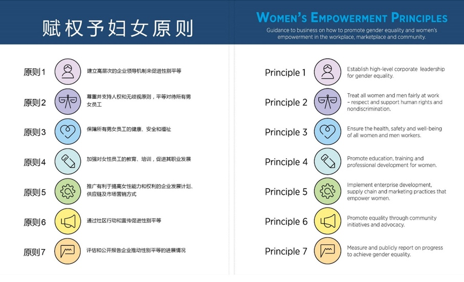 “賦權予婦女原則”(WEPs)是由聯合國婦女署與聯合國全球契約組織共同發起的行動倡議,它包含7條原則,指導企業在工作場所、市場和社區中推動性別平等。迄今為止,全球范圍內,包括阿爾卡特朗訊、宜家、微軟和聯合利華等4400多家公司和智聯招聘、等190多家中國企業都已簽署并承諾采取行動來踐行WEPs。 |