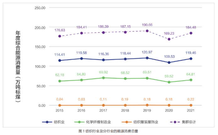 盛澤紡織產業能源消費正加快向高效、低碳、清潔轉變。一是能源消費總量呈現緩慢增長態勢。2015年至2019年,紡織產業規上企業能源消費總量增加了14.03萬噸標準煤,年均增速為1.93%;2020年受疫情影響,行業經濟發展與能源消費大幅下降,2021年伴隨行業經濟發展恢復,能源消費也恢復增至184.48萬噸標準煤,但仍低于2019年的水平。二是能源利用效率逐步提升。2015年以來,盛澤建立健全能源消費強度和總量“雙控”制度,紡織產業整體能耗強度保持下降趨勢。2021年紡織產業規上企業能耗強度為0.34噸標準煤/萬元,較2015年的下降了14.85%。三是能源消費結構不斷優化,能源消費正在從一次能源加快向二次能源轉型。2021年煤炭消費總量降至56.03萬噸標準煤,占集群能源消費總量的30.4%,較2015年下降了13個百分點;電力和熱力消費量之和占集群能源消費總量的66.3%,較2015年上升了約9個百分點。