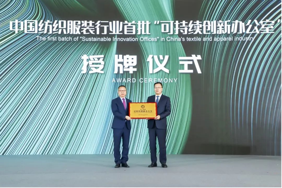 中國紡織工業聯合會會長孫瑞哲(圖左)為盛澤鎮人民政府授牌,盛澤鎮鎮長徐惠林(圖右)接牌。 為了進一步服務盛澤紡織產業綠色低碳可持續發展,中國紡織工業聯合會還在盛澤設立可持續創新辦公室,促進盛澤紡織產業可持續發展能力提升,推動盛澤世界級紡織產業氣候行動示范區建設。