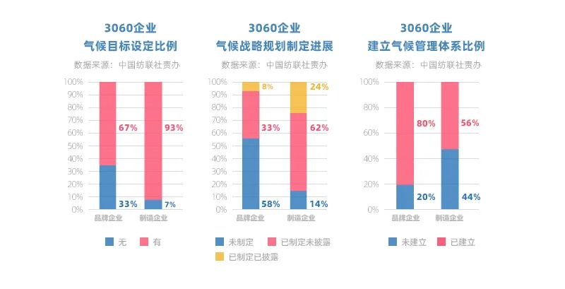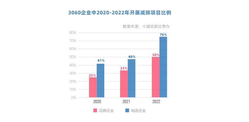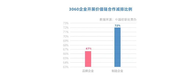 隨著國家推動并建立綠色低碳相關工廠與產(chǎn)品等評價方法,紡織企業(yè)積極響應,錨定產(chǎn)業(yè)轉型新機遇,3060企業(yè)已有27%完成開發(fā)低碳/零碳相關試點/示范項目。