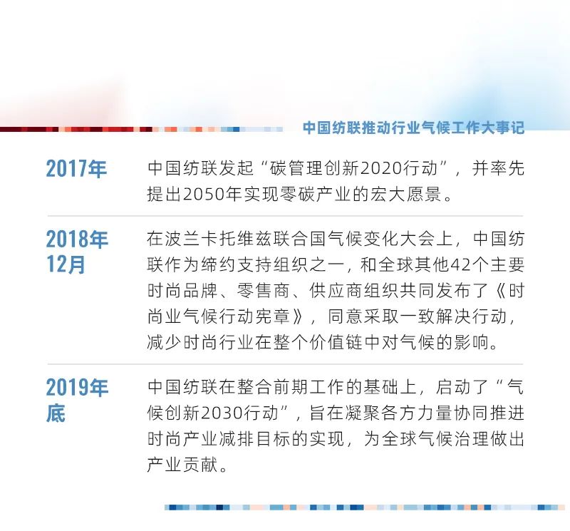 2020年9月22日中國宣布2030碳達峰2060碳中和戰(zhàn)略目標,次日中國紡織工業(yè)聯(lián)合會秋季聯(lián)展全面推進氣候創(chuàng)新行動,第一時間響應國家雙碳戰(zhàn)略目標。2021年6月1日中國紡織工業(yè)聯(lián)合會正式啟動了“中國時尚品牌氣候創(chuàng)新碳中和加速計劃”,簡稱“30·60碳中和加速計劃”,目前21家品牌企業(yè),42家制造企業(yè)陸續(xù)加入,支持綠色低碳技術研發(fā)推廣和應用,全面推進可信低碳產(chǎn)品、支持可持續(xù)消費,共同推進行業(yè)氣候行動。