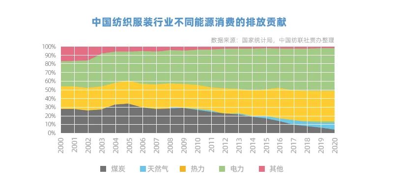 從能源結構來看,中國紡織服裝行業(yè)不斷優(yōu)化能源結構,推進行業(yè)能源使用的低碳轉型。中國紡織服裝行業(yè)排放絕大部分來自能源使用(主要是電力和蒸汽),到2020年,“煤改氣”“煤改電”取得顯著進展,行業(yè)煤炭消耗占比從30%顯著下降至低于10%,電氣化程度不斷提高。