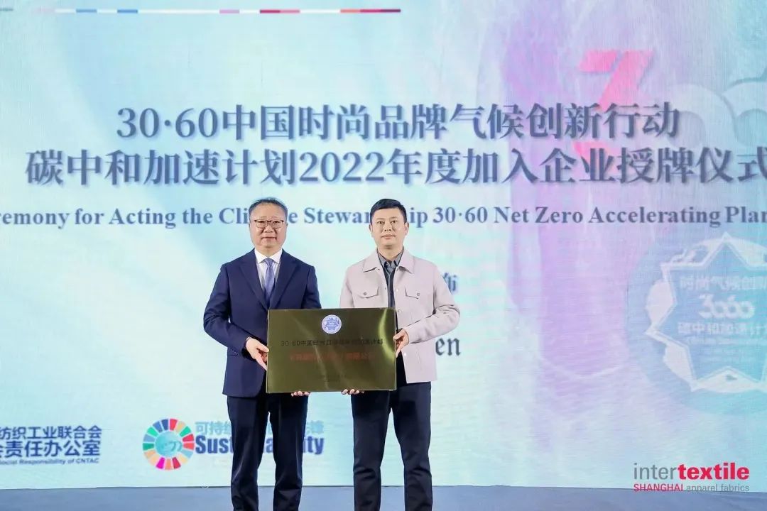 會上舉行了30·60中國時尚品牌氣候創新行動碳中和加速計劃2022年度加入企業授牌儀式。孫瑞哲為鄂爾多斯、卡賓服飾、達利中國、廣東兆天的企業代表頒發牌匾。