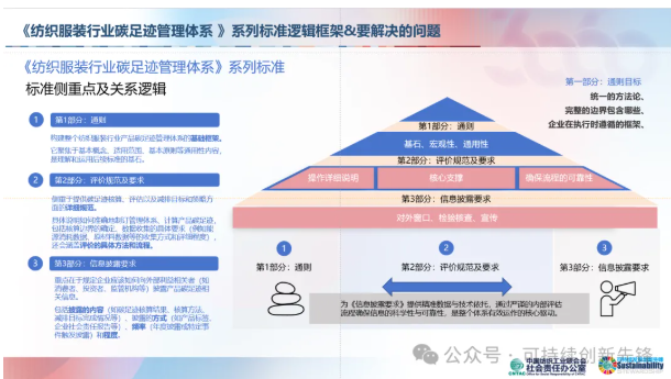 中國紡聯可持續發展助理研究員胡雪睿對標準的預期規劃、編制思路及重點問題進行了詳細解讀。紡織服裝行業產品碳足跡管理體系是一個系列標準主要包括通則、評價規范及要求、信息披露三大部分。其中,通則作為標準的基石,明確了基本概念和適用范圍;評價規范及要求對碳足跡統計方法和流程進行詳細規范;而信息披露部分則重點對碳足跡數據的披露內容、形式和頻率進行統一要求,是標準對外透明化的窗口。該標準的制定在產品碳足跡上參考了國際標準ISO 14067,在管理體系上結合了國家能源管理體系和環境管理體系的相關要求,以保證標準的科學性、適用性和可操作性,推動紡織行業建立更加規范和高效的碳足跡管理系統。