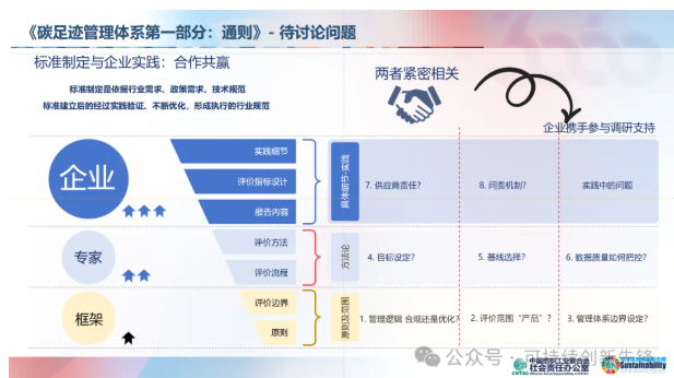 在隨后開展的深度研討環節,來自行業協會、研究機構及企業的專家代表圍繞標準的核心內容、實施路徑及可能面臨的挑戰展開了熱烈討論,并對草案提出了建設性建議,包括管理邏輯、標準名稱、管理體系邊界設定、管理目標設定、供應鏈管理、數據質量要求等八大問題。這一環節為標準的進一步優化奠定了堅實基礎,從實際操作到未來推廣提出了諸多建設性意見,進一步推動了標準內容的完善,也為行業凝聚了更多共識和力量。