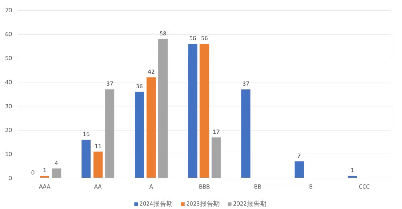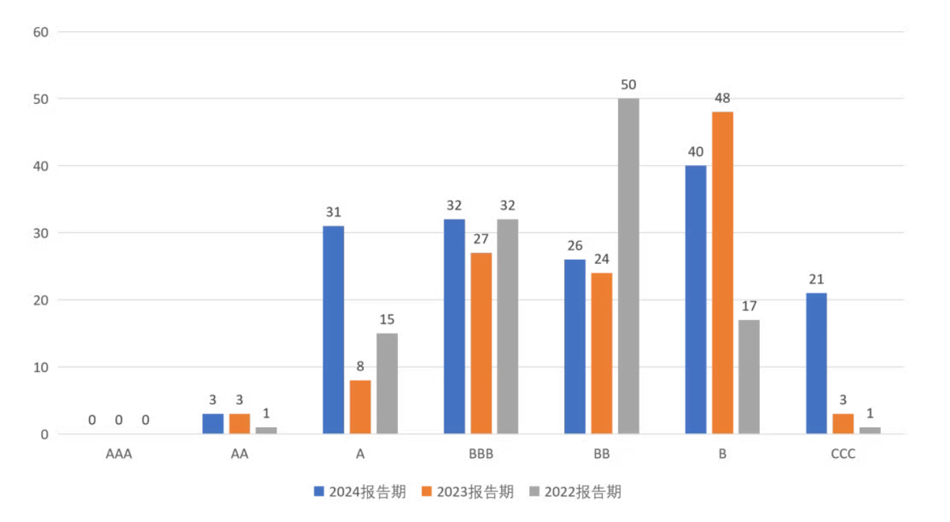 公司治理評估中,上市企業(yè)信息披露差異性相較其他維度較小。相較于2023報告期,評估結構明顯下沉,BBB及以上企業(yè)比例下降,BB級比例更由不到5%跳升至三成以上,并首次出現(xiàn)B級和CCC級企業(yè),尾部風險顯著抬升。造成這種變化的首要原因是供應鏈盡責管理要求的提升。