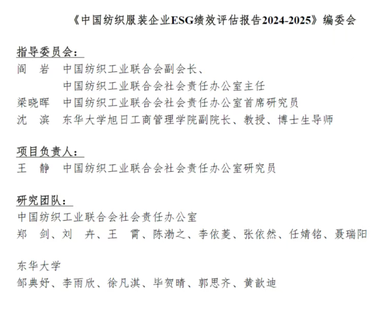本次行業(yè)ESG績效評估工作由中國紡織工業(yè)聯(lián)合會社會責任辦公室和東華大學聯(lián)合開展。中國紡織服裝行業(yè)ESG評估體系基于CSC9000T社會責任管理框架,構建了三級指標架構;在以往成果基礎上,立足2024-2025報告期特點,對“中國紡織服裝企業(yè)ESG指標體系”完成再次開發(fā),包含環(huán)境、社會、公司治理3項一級指標,以及二級指標17項,三級指標104項。