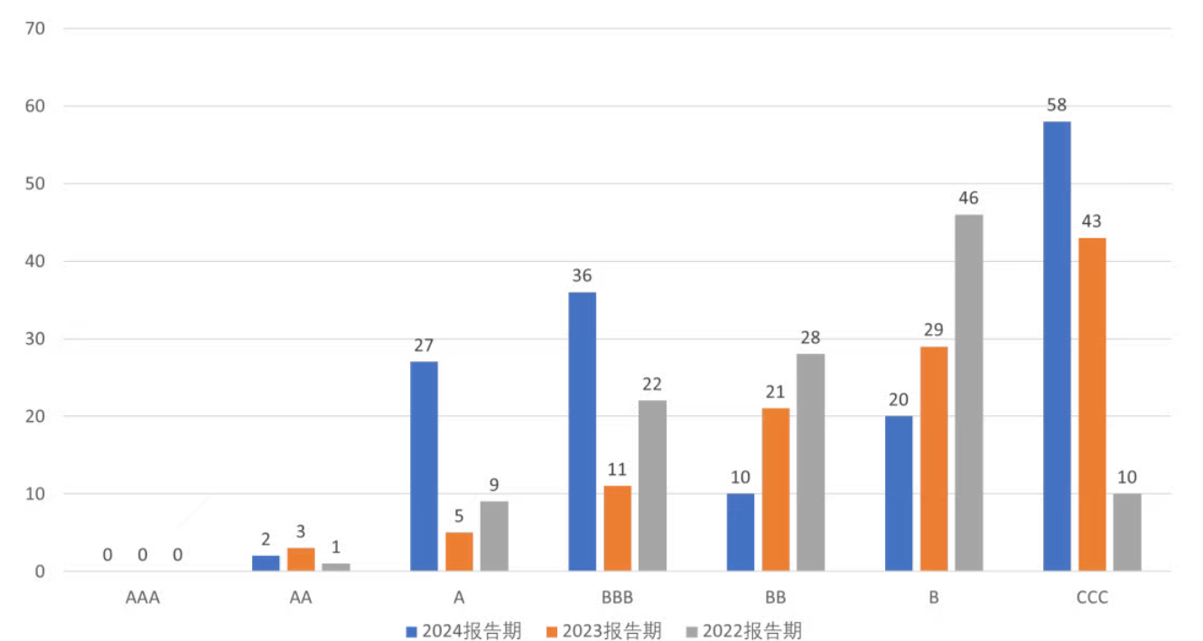 環(huán)境評估中,分布結構呈現(xiàn)出典型的“金字塔”形態(tài),行業(yè)內部分化與梯隊差距顯著。較于2023報告期,行業(yè)整體在環(huán)境維度的評估提升較大,頭部企業(yè)率先加大了在環(huán)境方面的投入與披露;然而,行業(yè)平均分仍處于較低水平,且CCC級企業(yè)數量龐大。