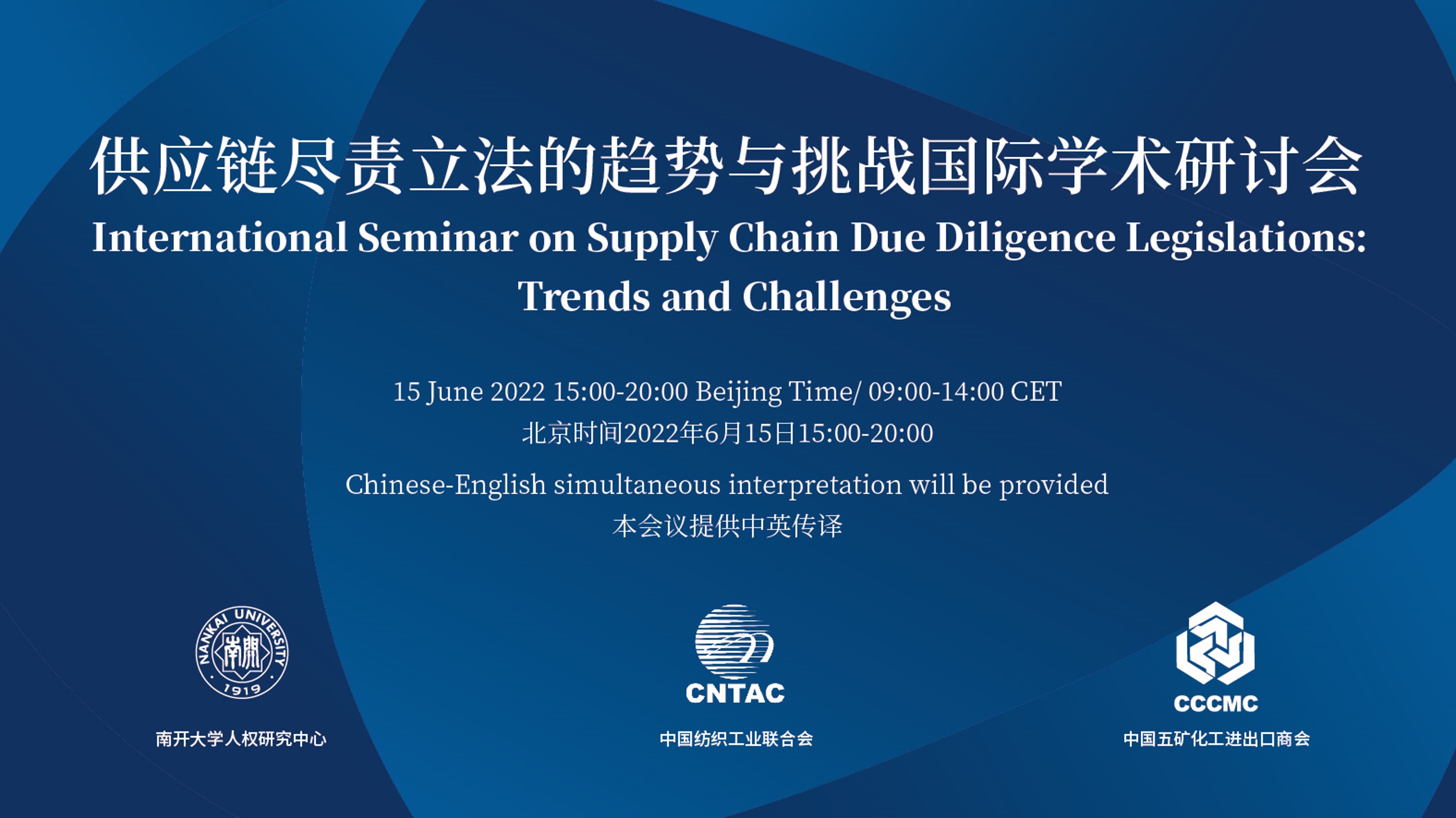 2022年6月15日,由南開大學(xué)人權(quán)研究中心主辦,中國(guó)紡織工業(yè)聯(lián)合會(huì)和中國(guó)五礦化工進(jìn)出口商會(huì)合辦的“供應(yīng)鏈盡責(zé)立法的趨勢(shì)與挑戰(zhàn)國(guó)際學(xué)術(shù)研討會(huì)”通過(guò)在線平臺(tái)順利舉行,超過(guò)一千八百人次實(shí)時(shí)觀看了此次研討會(huì)。