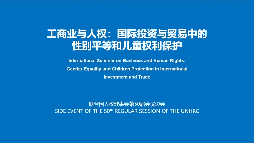在聯(lián)合國(guó)人權(quán)理事會(huì)第50屆會(huì)議期間,以“工商業(yè)與人權(quán):國(guó)際投資與貿(mào)易中的性別平等和兒童權(quán)利保護(hù)”為主題的云上邊會(huì)7月6日舉行。